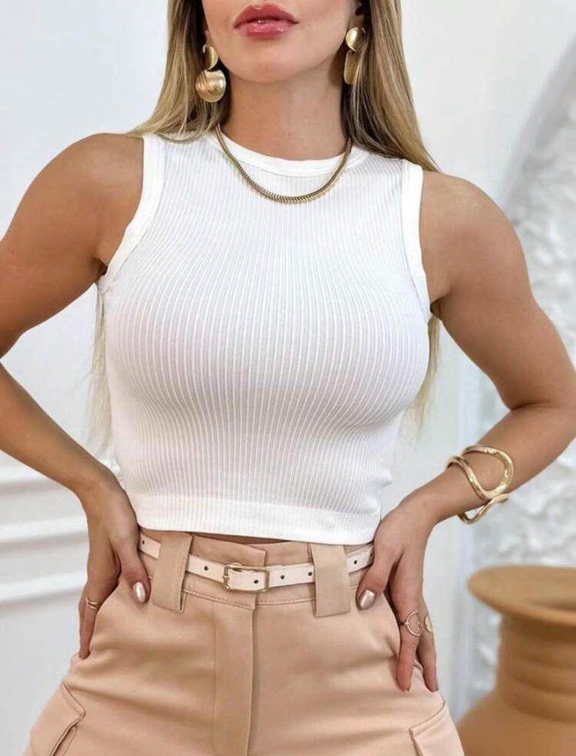 A regata cropped canelada branca é a peça-chave que une conforto e sofisticação. Com modelagem justa ao corpo e tecido canelado que valoriza a silhueta, essa blusa sem mangas é perfeita para compor looks modernos e elegantes. O acabamento em gola careca traz um toque clean, enquanto o corte cropped adiciona estilo e versatilidade.
